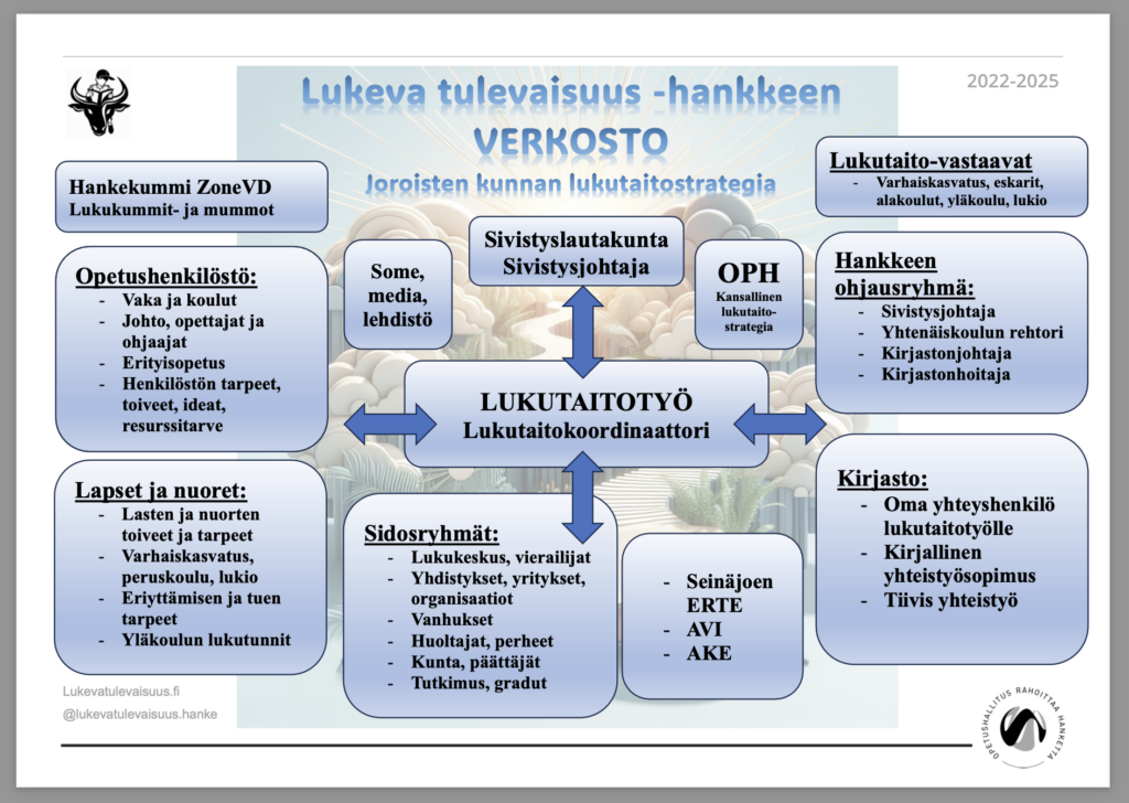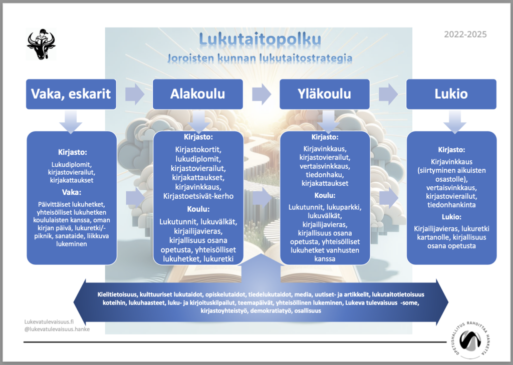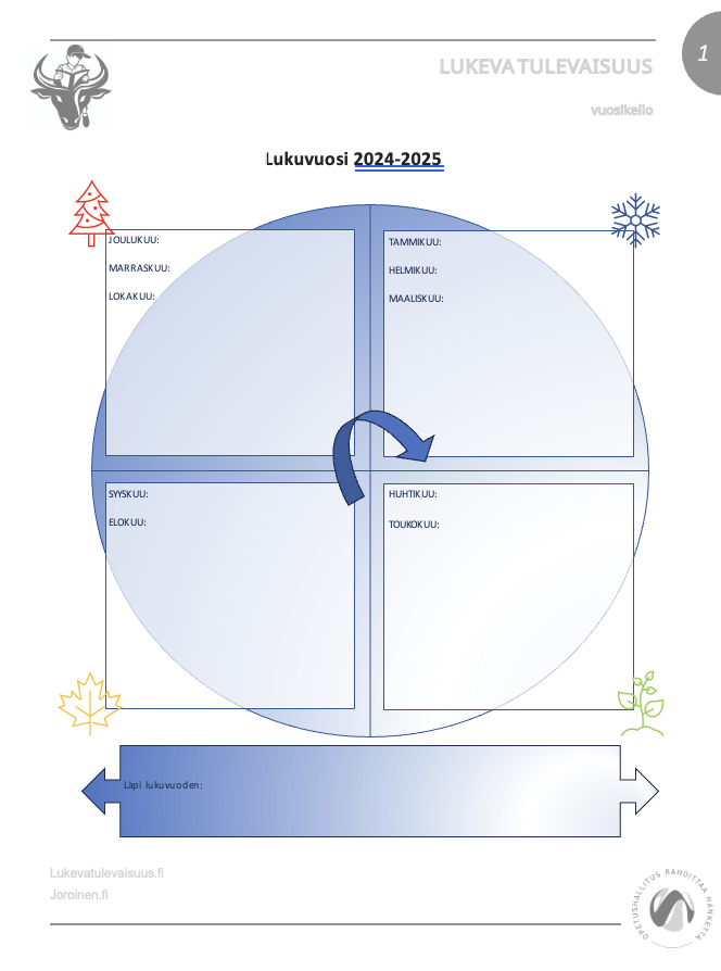 Vuosikello ohjaa tulevaisuuden toimintaa kouluyhteisön ja verkoston osalta ja toimii näin ollen työkaluna. Hankkeen aikana vastuutetaan henkilöitä eri toimialoilta huolehtimaan pitkäjänteisestä lukutaitotyöstä, ja toimintaa seurataan. Hanke hyödyntää sekä Kansallista lukutaitostrategiaa 2030 että Lukeva koulu- mallia.